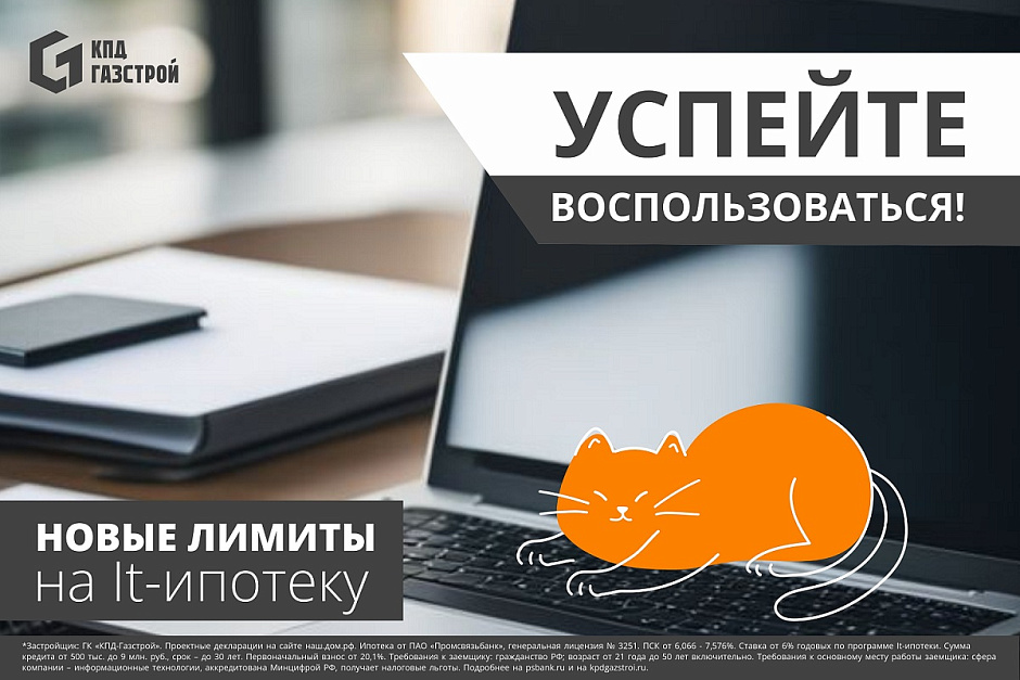 *Застройщик: ГК «КПД-Газстрой». Проектные декларации на сайте наш.дом.рф. Стоимость указана на 2 комнатную квартиру 53,9 кв. м. в доме №57 по ГП в микрорайоне Чистая Слобода, на 2 комнатную квартиру студию 52,7 кв. м. в доме №12 по ГП в районе Околица, на 2 комнатную квартиру студию 47.1 кв. м. в доме №3 по ГП в ЖК «Тайгинский парк», на 3 комнатную квартиру студию 65,3 кв. м. в доме №1 по ГП в ЖК «Калина Красная». Предложение ограничено, действует на определенные номера квартир. Ипотека от ПAO «Промсвязьбанк», генеральная лицензия № 3251. ПСК от 6,066 - 7,576%. Ставка от 6% годовых по программе It-ипотеки. Сумма кредита от 500 тыс. до 9 млн. руб., срок – до 30 лет. Первоначальный взнос от 20,1%. Требования к заемщику: гражданство РФ; возраст от 21 года до 50 лет включительно. Требования к основному месту работы заемщика: сфера компании – информационные технологии, аккредитована Минцифрой РФ, получает налоговые льготы. Подробнее на psbank.ru и на kpdgazstroi.ru.