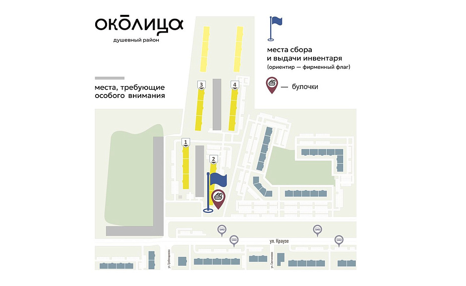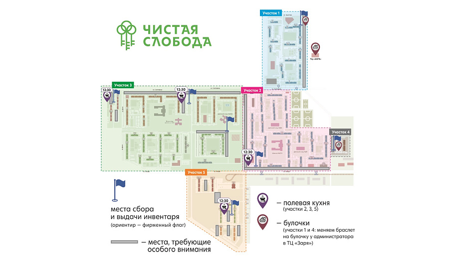 В 12:30, после сдачи инвентаря, все участники субботника в обмен на специальные браслеты получат вкусное угощение. Ждем всех на субботник! Не забудьте про простую и удобную одежду, особенно про резиновые сапоги! Места выдачи инвентаря, зоны, требующие особого внимания и точки с угощениями - отмечены на картах.